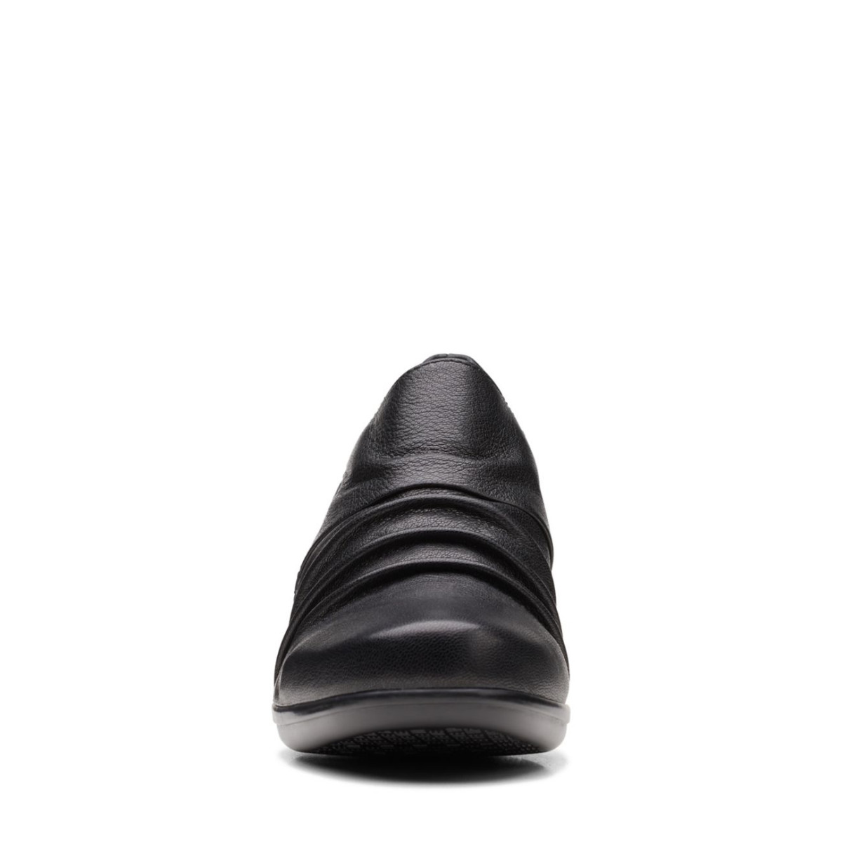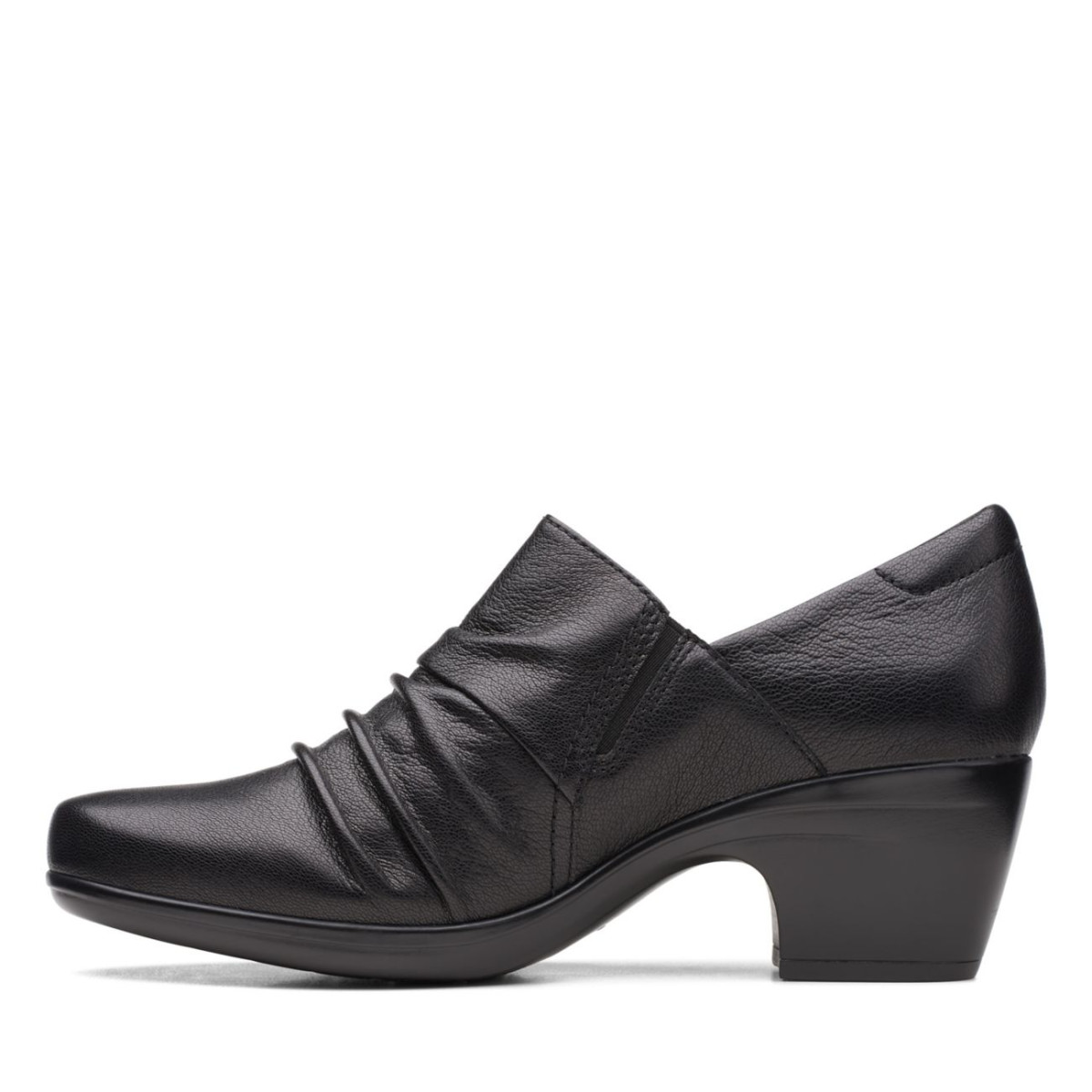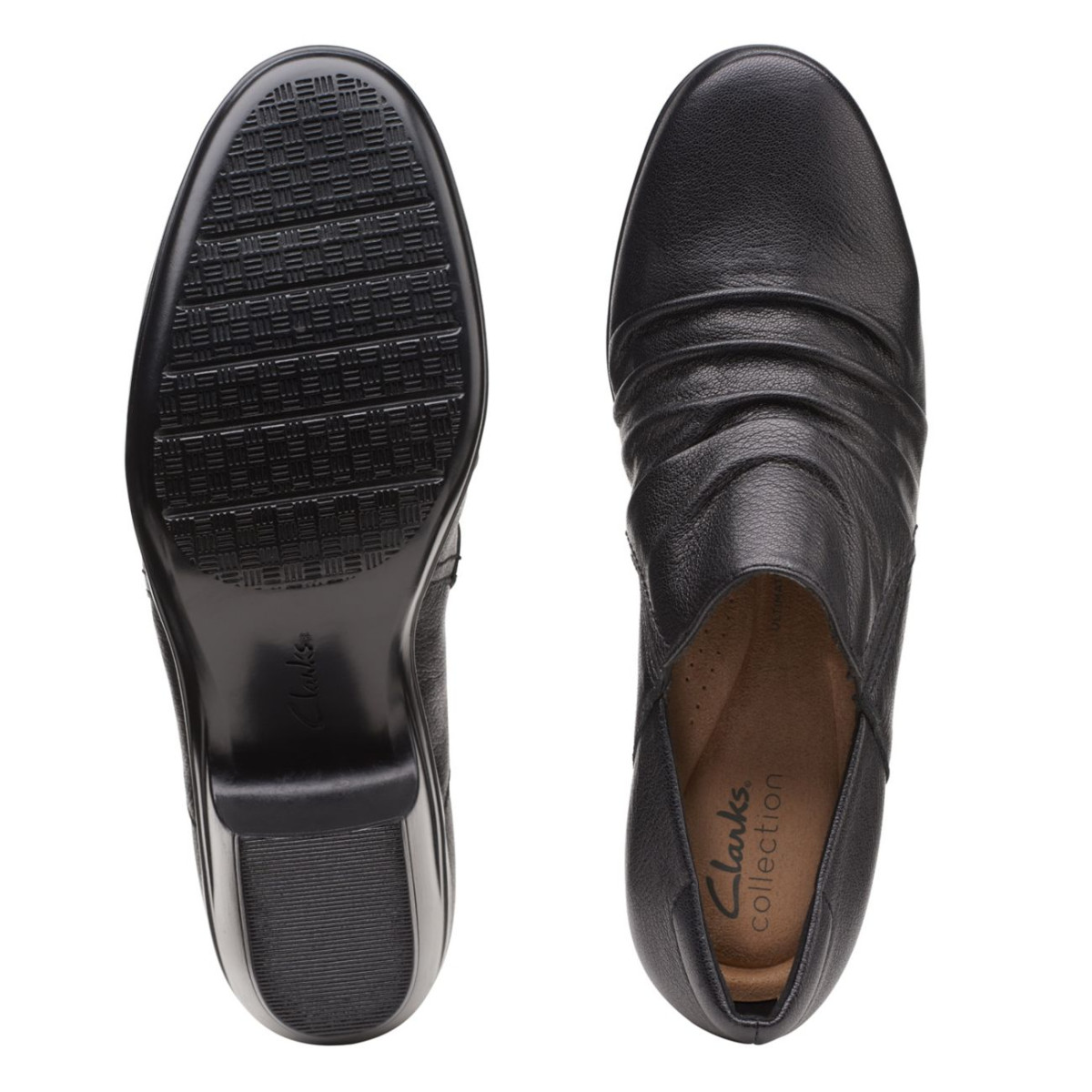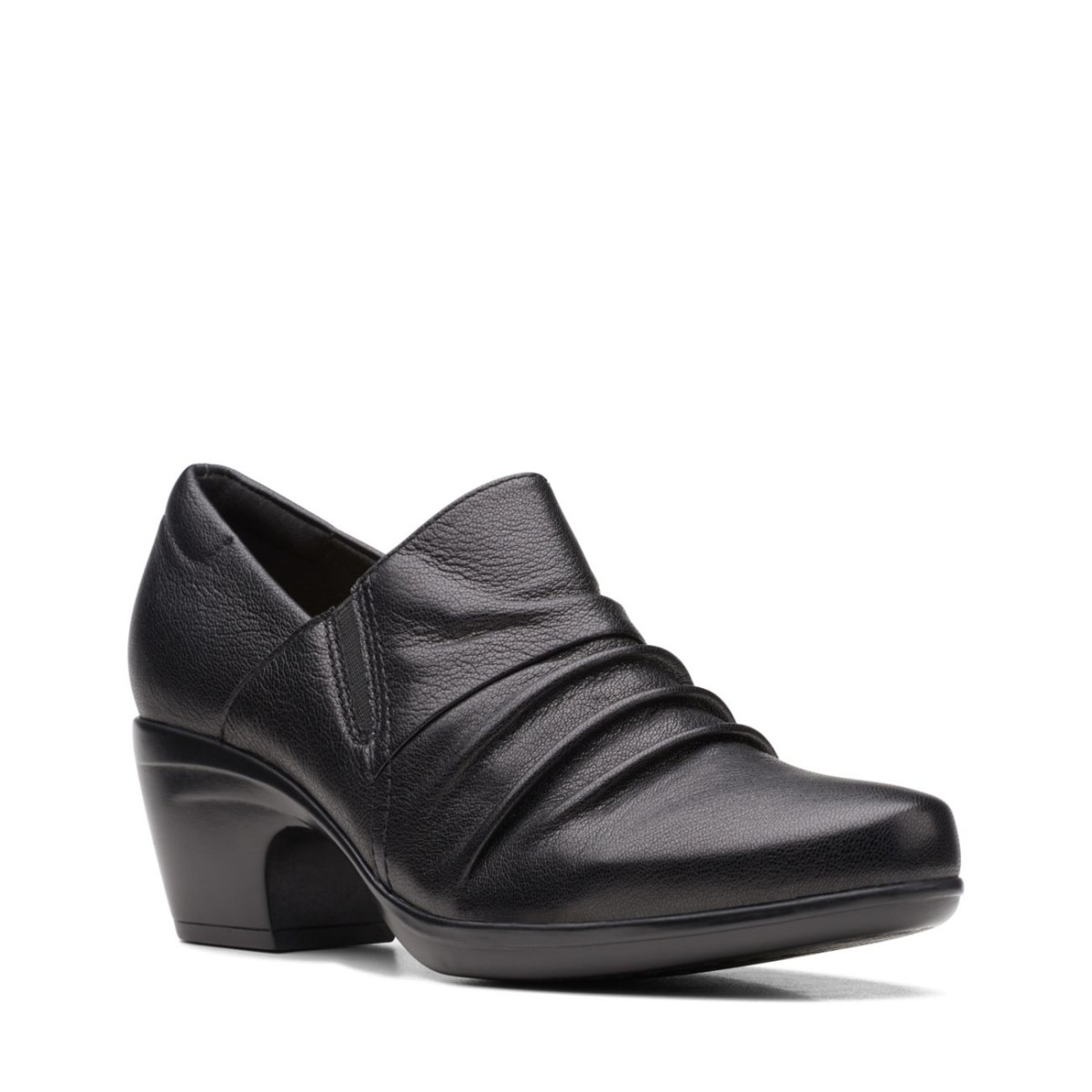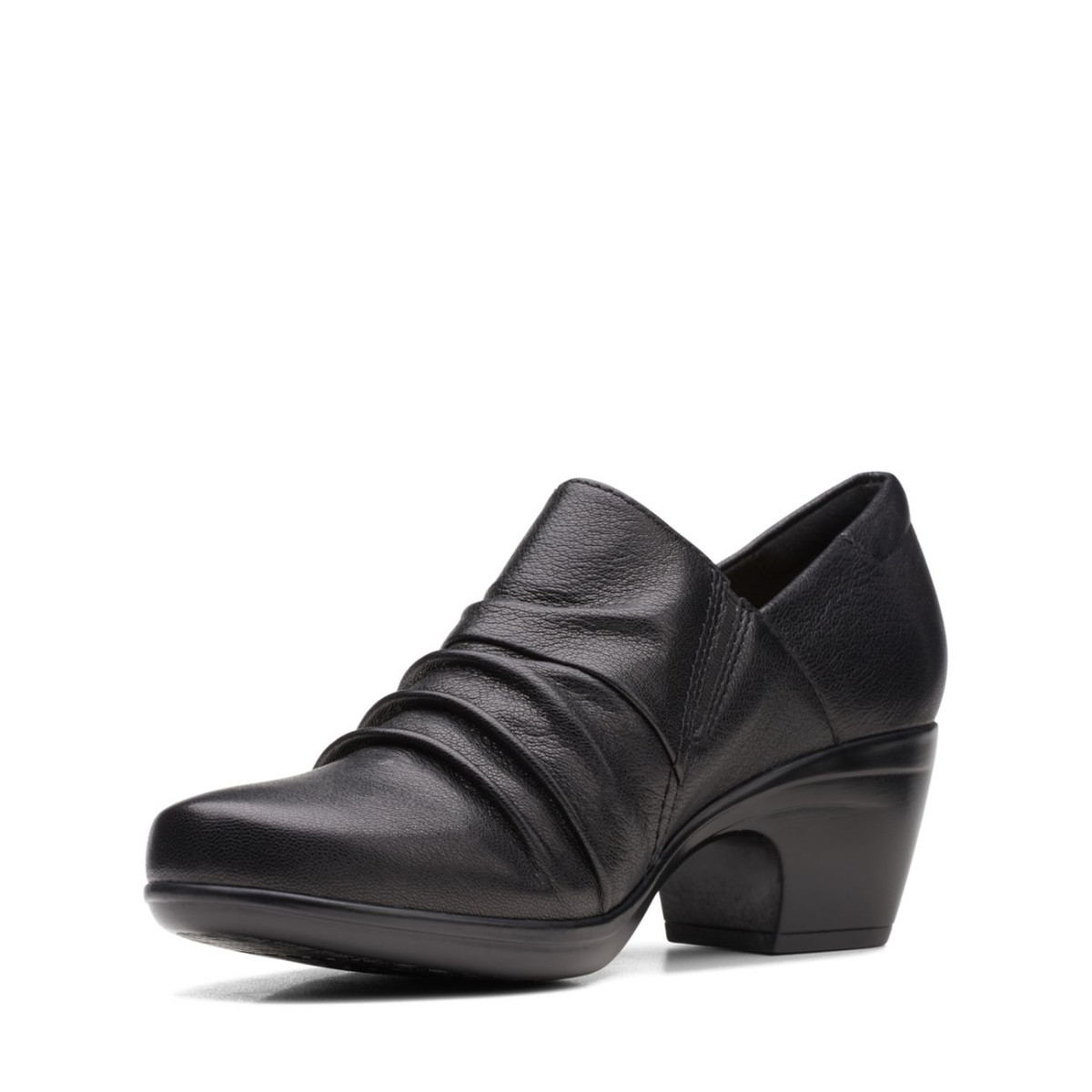 A chic shoe made for everyday wear, meet Emily Cove - your next go-to heel. Crafted for day-long comfort, plush underfoot cushioning brings joy to every step, while its ruched black leather finish and sculpted heel create a polished look perfect for work to weekend wear.