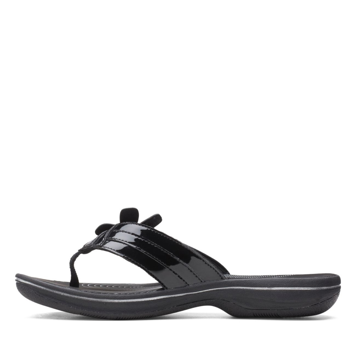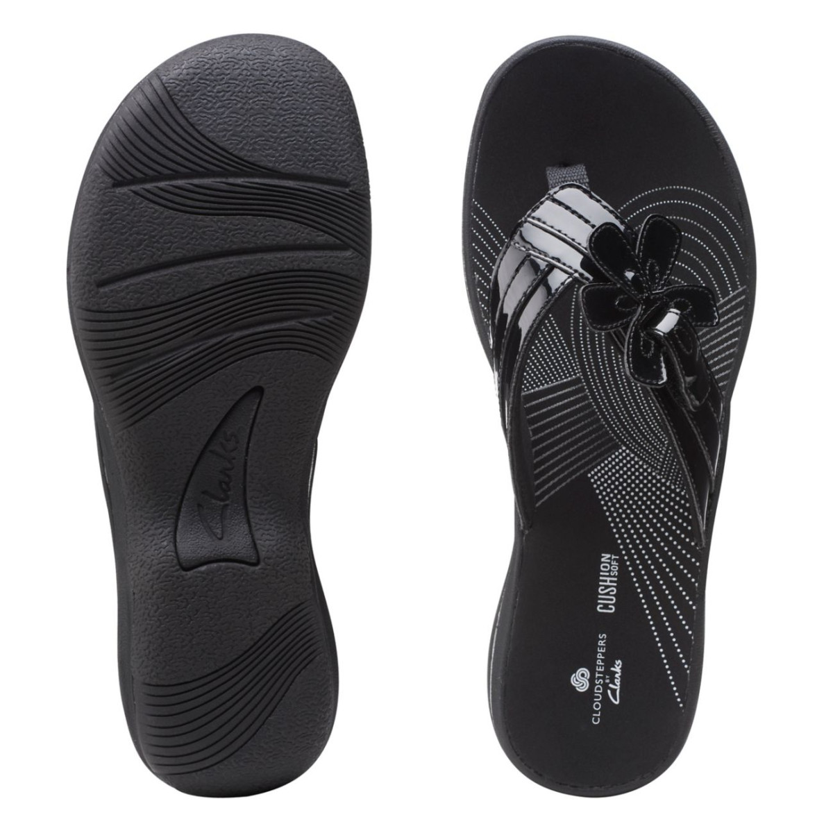 Pack light, step lighter. The Cloudsteppers™ Brinkley Flora flip-flop comes in classic black patent for the ultimate in versatile summer wear. A cushioned EVA midsole and footbed support and protect the foot from shells and beach pebbles without adding any extra weight.